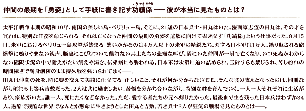 太平洋戦争末期の昭和19年、南国の美しい島・ペリリュー島。そこに、21歳の日本兵士・田丸はいた。漫画家志望の田丸は、その才を買われ、特別な任務を命じられる。それは亡くなった仲間の最期の勇姿を遺族に向けて書き記す「功績係」という仕事だった。9月15日、米軍におけるペリリュー島攻撃が始まる。襲いかかるのは4万人以上の米軍の精鋭たち。対する日本軍は1万人。繰り返される砲爆撃に鳴りやまない銃声、脳裏にこびりついて離れない兵士たちの悲痛な叫び。隣にいた仲間が一瞬で亡くなり、いつ死ぬかわからない極限状況の中で耐えがたい飢えや渇き、伝染病にも襲われる。日本軍は次第に追い詰められ、玉砕すらも禁じられ、苦し紛れの時間稼ぎで満身創痍のまま持久戦を強いられてゆく――。