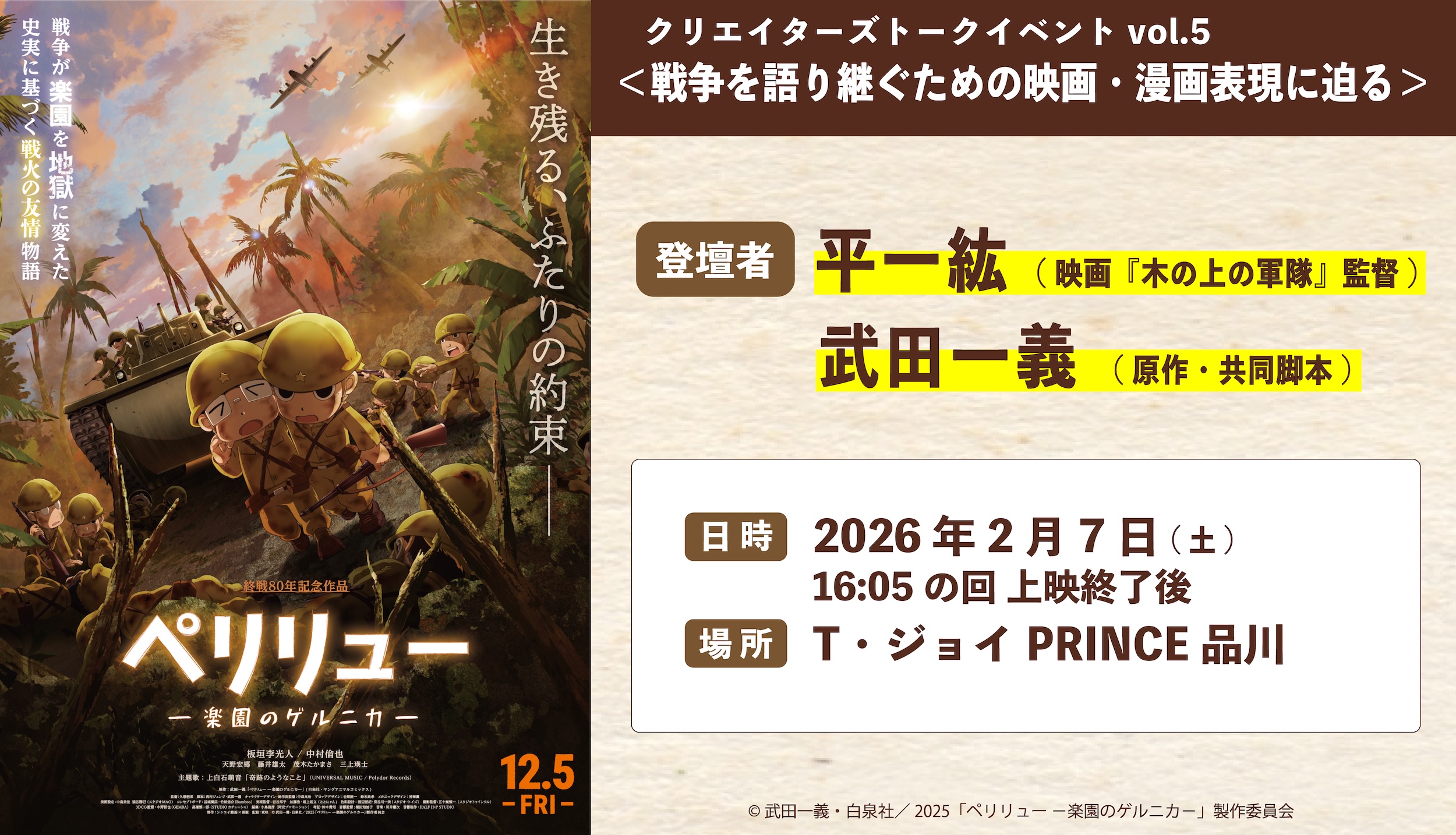 2月7日(土)に、T・ジョイPRINCE品川(東京都)にて『ペリリュー ―楽園のゲルニカ―』公開記念クリエイターズトークvol.5の実施が決定いたしました!
