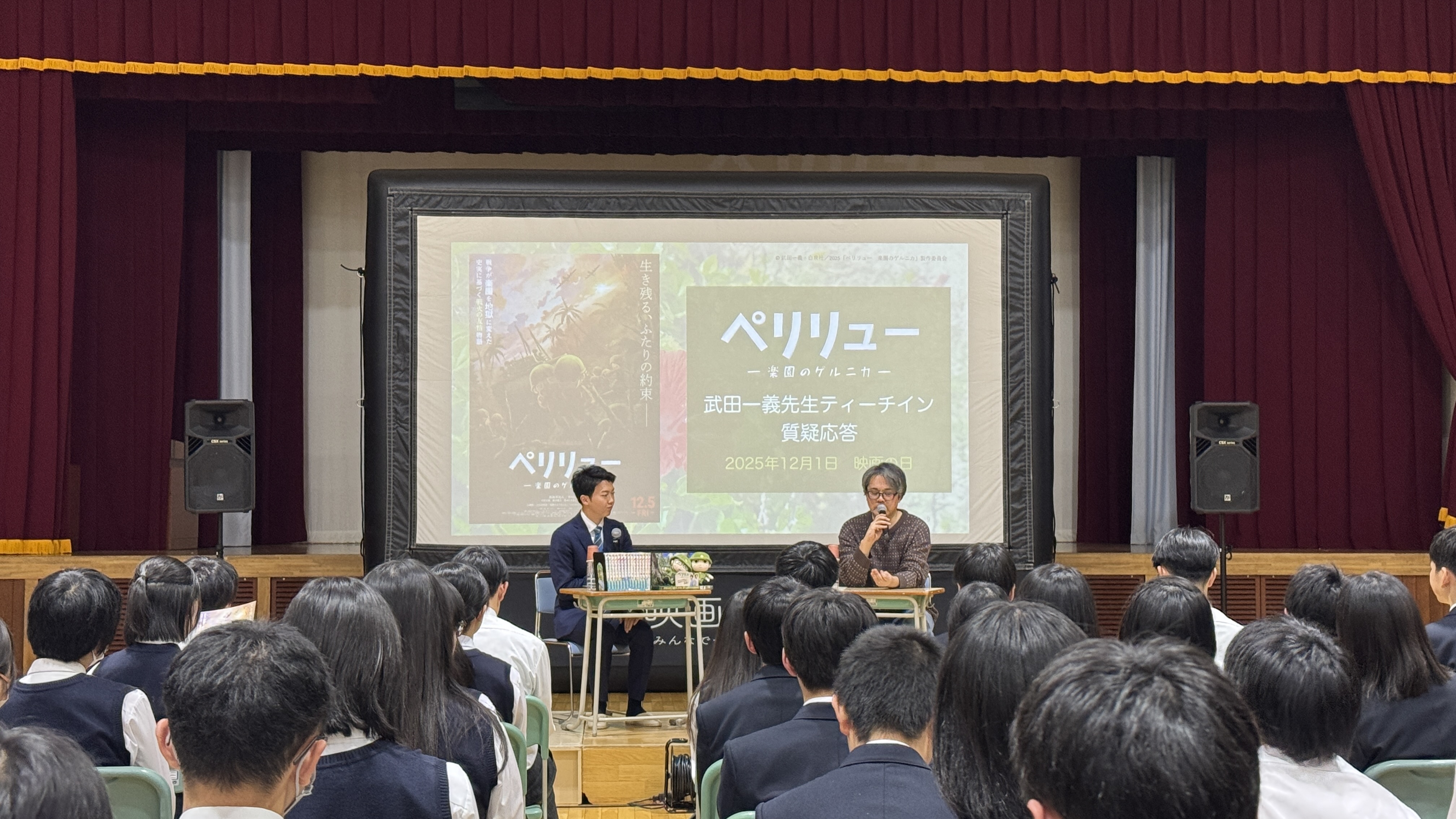 イベントの終盤には、作品を観て抱いた悲しさやつらさをそのまま大事にしながら成長してほしいという武田からのメッセージも伝えられました。改めて家族や友人と劇場で観てもらいたいという言葉を添え、イベントは東部中学校の全校生徒387名の大きな拍手の中で締めくくられました。